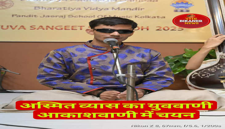 THE BIKANER NEWS. उदीयमान शास्त्रीय संगीत कलाकार अस्मित व्यास ने आकाशवाणी कोलकाता द्वारा हाल ही में आयोजित युवावाणी के ऑडिशन में अपनी उत्कृष्ट प्रतिभा का परिचय दिया एवं उनका चयन तीन श्रेणियो भजन, ठुमरी एवं भारतीय शास्त्रीय संगीत में हुआ। युववाणी में तीन श्रेणियो में चयन ये दरशाता है अस्मित न केवल पारंपरिक शास्त्रीय संगीत में दक्ष है, बल्की उनकी प्रस्तुति में भावपूर्ण अभिव्यक्ति एवं तकनिकी परिपक्वताभी निहित है।