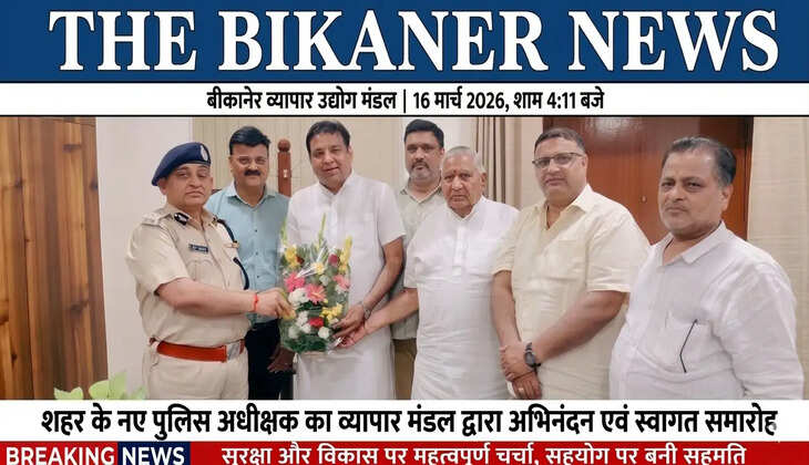 THE BIKANER NEWS:-बीकानेर। बीकानेर व्यापार उद्योग मण्डल के प्रतिनिधिमण्डल ने नव पदस्थ पुलिस महानिरीक्षक श्री ओमप्रकाश जी का पुष्पगुच्छ भेंट कर एवं दुपट्टा पहनाकर स्वागत एवं अभिनंदन किया। इस अवसर पर मण्डल पदाधिकारियों ने उन्हें स्मृति चिन्ह भेंट कर सम्मानित भी किया।