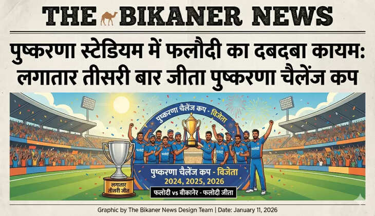 THE BIKANER NEWS:-बीकानेर।स्थानीय पुष्करणा स्टेडियम में आयोजित प्रतिष्ठित पुष्करणा चैलेंज कप 2026 का फाइनल मुकाबला बेहद रोमांचक रहा, जिसमें लटियाल क्लब फलौदी ने शानदार प्रदर्शन करते हुए खिताबी जीत दर्ज की। यह जीत इसलिए भी ऐतिहासिक है क्योंकि फलौदी की टीम ने लगातार तीसरी बार इस टूर्नामेंट का चैंपियन बनने का गौरव हासिल किया है। खास बात यह रही कि तीनों ही बार फाइनल में उनके सामने पुष्करणा क्रिकेट एकेडमी (PCA) की टीम थी, जिसे हार का सामना करना पड़ा।
