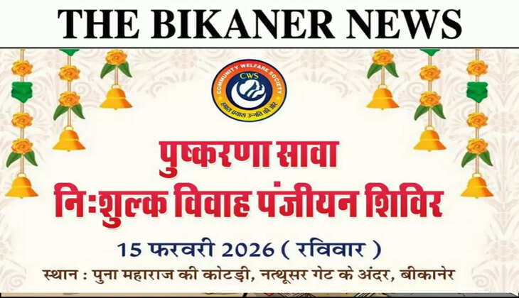 THE BIKANER NEWS:बीकानेर:-कम्युनिटी वेलफेयर सोसाइटी के राजकुमार किराडू ने बताया की संस्था के तत्वावधान में पुष्करणा समाज के उन नवविवाहित जोड़ों के लिए, जिन्होंने पुष्करणा सावे में परिणय सूत्र में बंधन किया है, एक नि:शुल्क विवाह पंजीयन शिविर का आयोजन 15 फरवरी 2026 (रविवार) को किया जा रहा है। यह शिविर पुना महाराज की कोठड़ी, नत्थूसर गेट के अंदर, बीकानेर में आयोजित होगा।