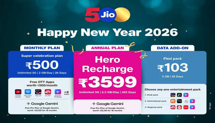 हैप्पी न्यू ईयर 2026 ऑफर्स के तहत जियो ने ₹3599 का हीरो एनुअल रिचार्ज पेश किया है। इस प्लान में 365 दिनों की वैधता के साथ अनलिमिटेड 5G, 2.5 GB प्रतिदिन हाई-स्पीड डेटा, अनलिमिटेड वॉयस कॉल और 100 एसएमएस प्रतिदिन मिलते हैं। इसके साथ गूगल जेमिनी का 18 महीने का Pro Plan भी दिया जा रहा है, जिसकी अनुमानित कीमत ₹35,100 बताई गई है।