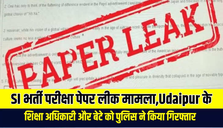 Rajasthan News : उदयपुर, 16 जूनः राजस्थान सब-इंस्पेक्टर भर्ती परीक्षा-2021 के पेपर लीक मामले में स्पेशल ऑपरेशन ग्रुप (एसओजी) ने शनिवार को उदयपुर के मुख्य जिला शिक्षा अधिकारी बुद्धसागर उपाध्याय और उनके बेटे आदित्य उपाध्याय को गिरफ्तार किया। एसओजी की जांच से पता चला कि दोनों पेपर लीक रैकेट से जुड़े थे और उन्होंने परीक्षा में अनियमितताओं को अंजाम देने में महत्वपूर्ण भूमिका निभाई थी।Rajasthan News